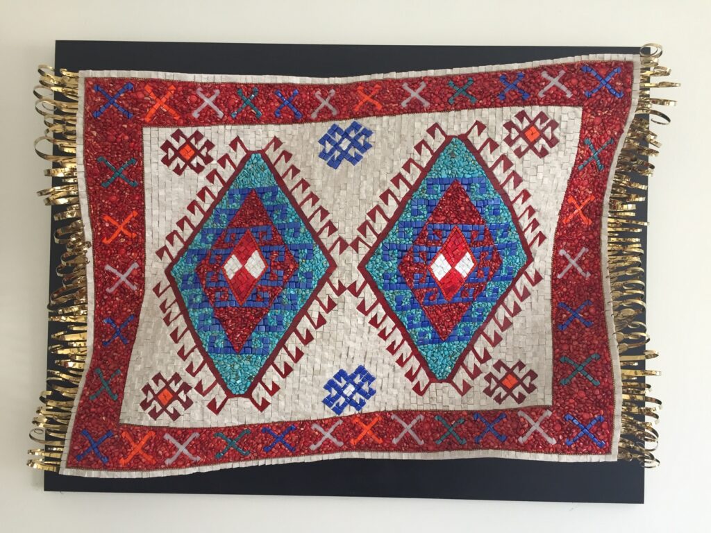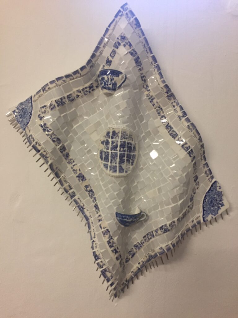 3 boyutlu halı kumaş üzerine, geri dönüşüm tabak ve fıncanlarla döşenmiştir.