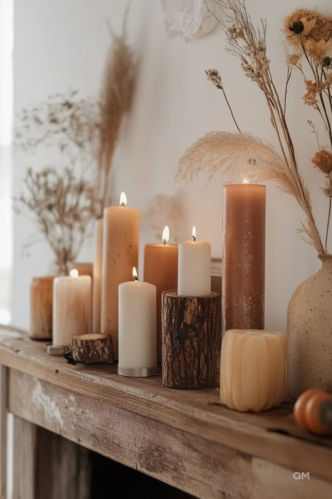 Büyük cam vazoların içine koyacağımız turuncu yapraklar, çam kozalakları ile ön kısımlarına koyacağımız mumlarla bir dekoratif bütünlük sağlayabiliriz. Alt kısmına yerleştireceğimiz hasır runner da etkiyi kuvvetlendirecektir. Bu tarz birliktelikleri koltuğun üzerinde duran örme turuncu kırlentin yanında bırakacağımız bir battaniyeyle de çeşitlendirebiliriz.